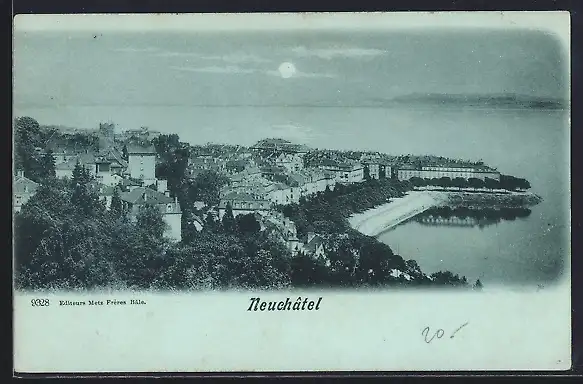 Mondschein-AK Neuchatel, Totalansicht mit Gewässer aus der Vogelschau