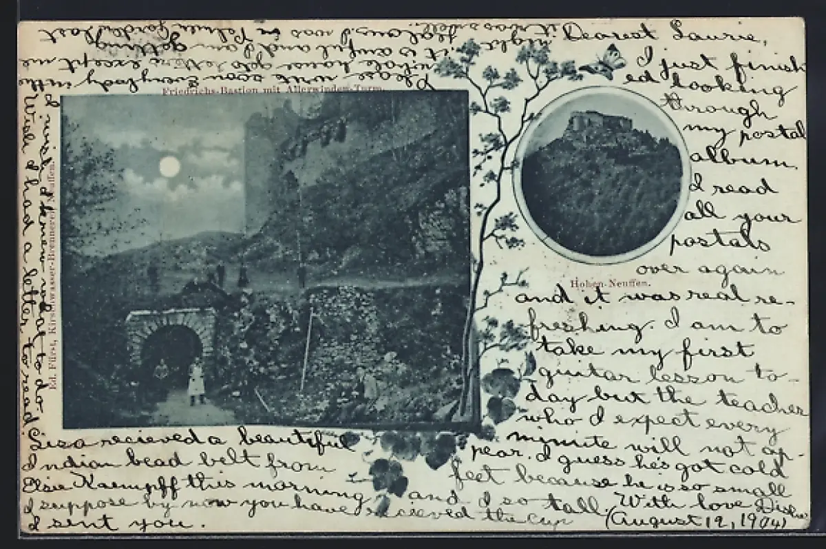 Mondschein-AK Neuffen, Friedrichs-Bastion mit Allerwinden-Turm, Hohen Neuffen
