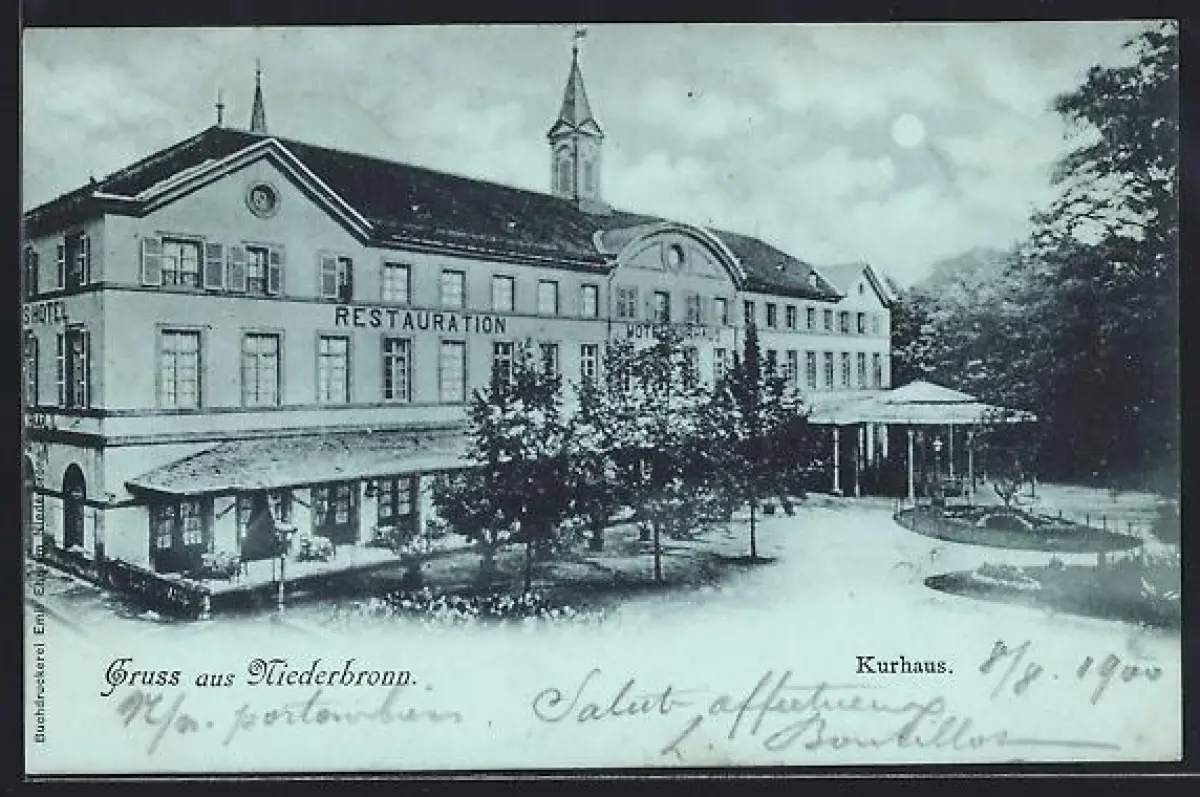 Mondschein-AK Niederbronn, Restaurant und Kurhaus