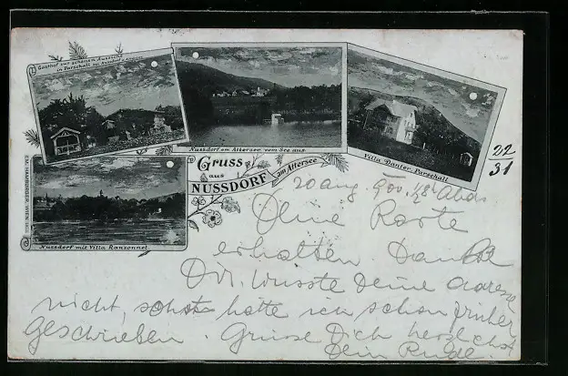 Mondschein-AK Nussdorf /Attersee, Ortsansicht mit Villa Ransonnet, Villa Danter, Gasthof zur schönen Aussicht