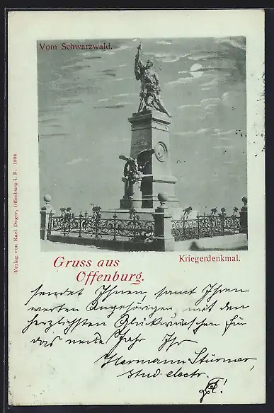 Mondschein-AK Offenburg, Kriegerdenkmal vom Schwarzwald