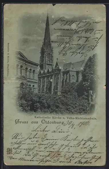 Mondschein-AK Oldenburg / O., Katholische Kirche und Volks-Mädchenschule
