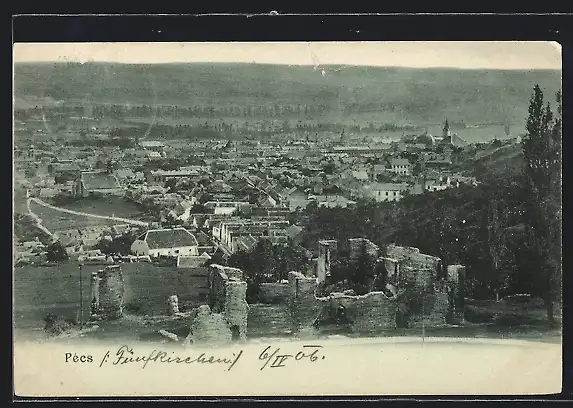 Mondschein-AK Pécs, Ortsansicht mit Ruine