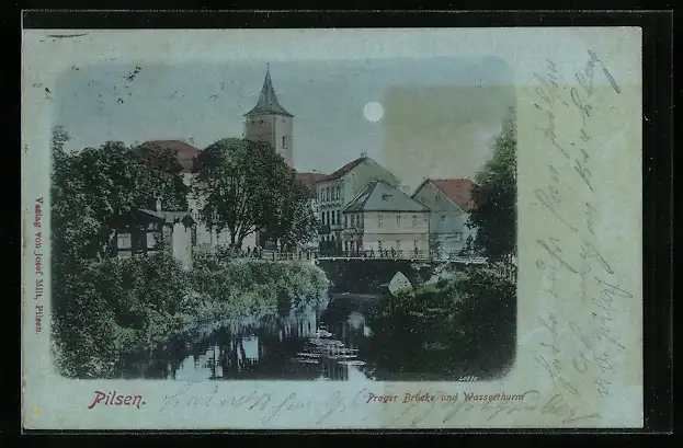 Mondschein-AK Pilsen, Prager Brücke und Wasserthurm