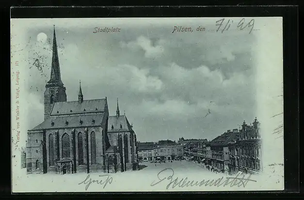Mondschein-AK Pilsen, Stadtplatz mit Kirche