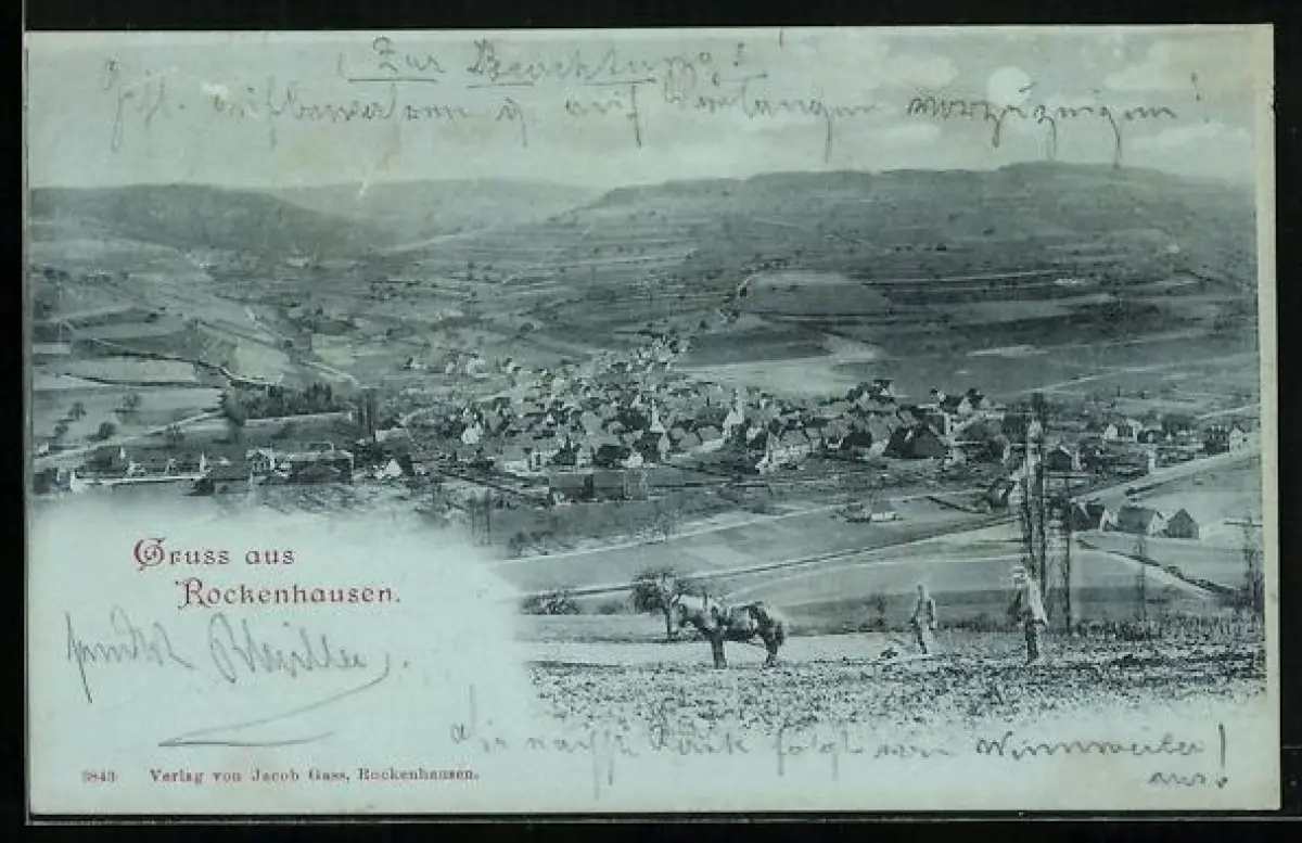 Mondschein-AK Rockenhausen, Ortsansicht vom Berghang aus