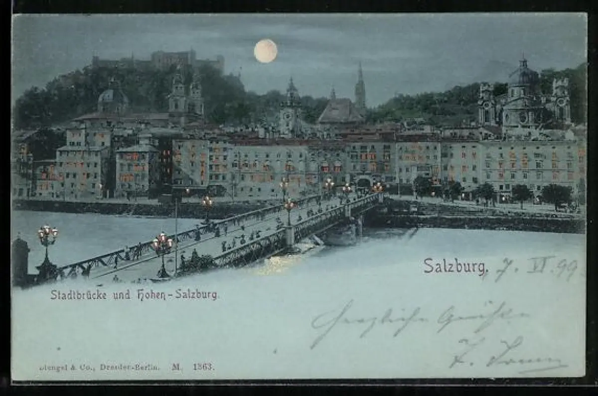 Mondschein-AK Salzburg, Stadtbrücke und Hohen-Salzburg, mit goldenen Fenstern u. Laternen