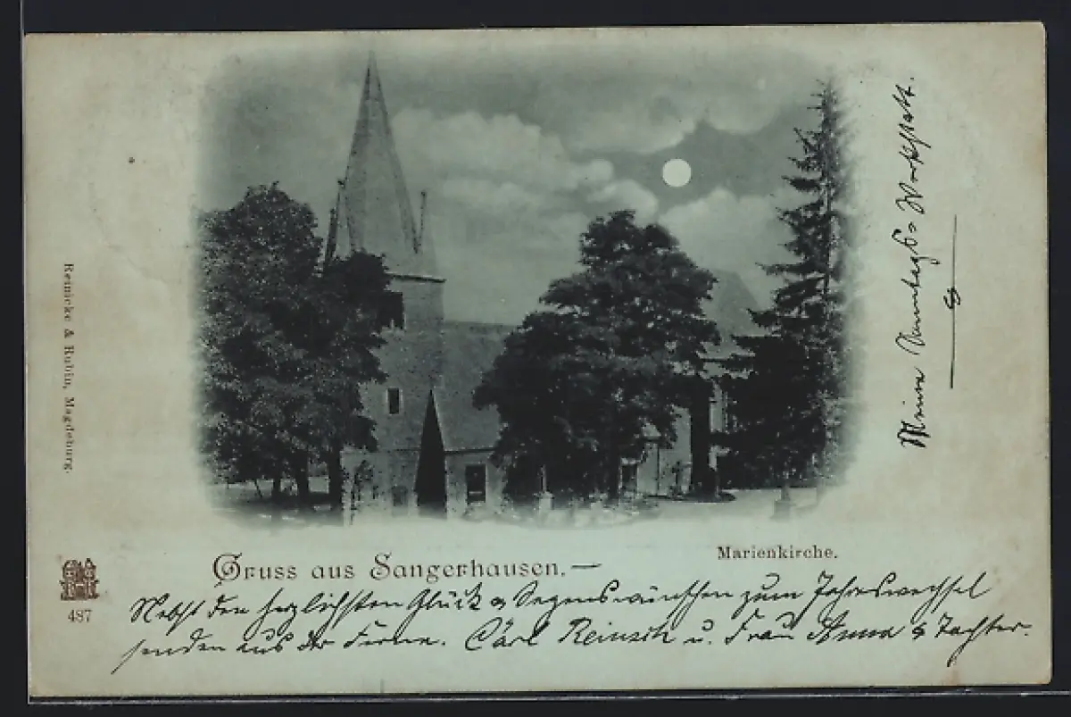 Mondschein-AK Sangerhausen, Blick auf die Marienkirche mit Mond