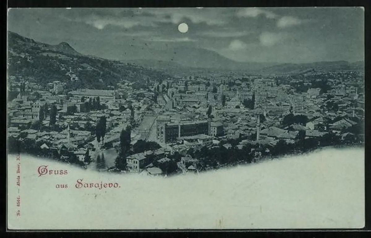 Mondschein-AK Sarajevo, Panorama mit Brücken
