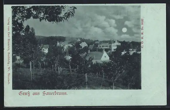 Mondschein-AK Sauerbrunn, Ortsansicht aus der Vogelschau