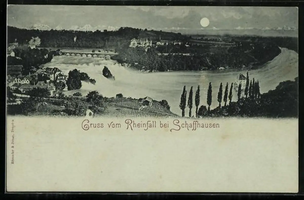 Mondschein-AK Schaffhausen, Teilansicht des Ortes und Blick auf den Rheinfall