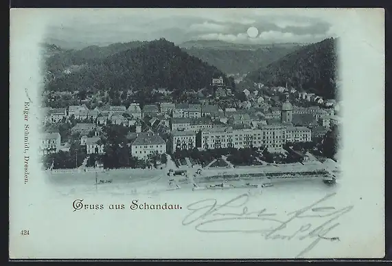 Mondschein-AK Schandau, Ortsansicht aus der Vogelschau