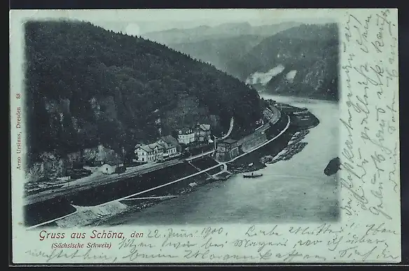 Mondschein-AK Schöna / Sächsiche Schweiz, Ortsansicht mit Fluss u. Bergpanorama aus der Vogelschau