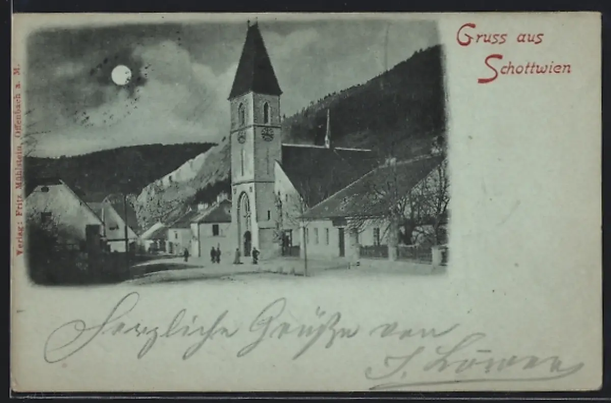 Mondschein-AK Schottwien, Strassenpartie mit Kirche