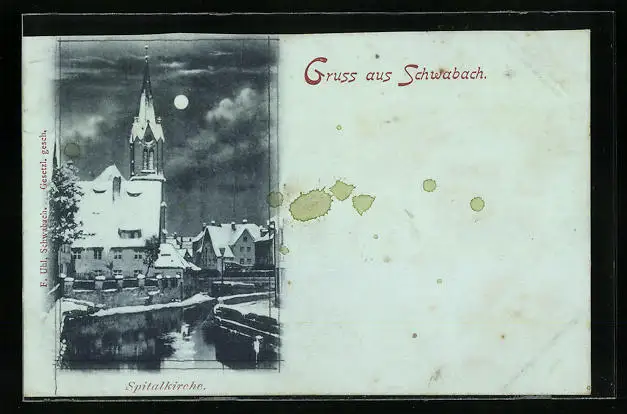 Mondschein-AK Schwabach, Blick auf die schneebedeckte Spitalkirche
