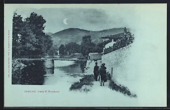 Mondschein-AK Semène, Promenade au bord de la rivière avec vue sur le pont et les collines