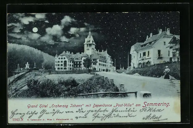 Mondschein-AK Semmering, Grand Hotel Erzherzog Johann mit Dependance Post-Villa