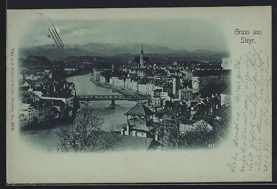 Mondschein-AK Steyr, Stadtpanorama mit Flusspartie