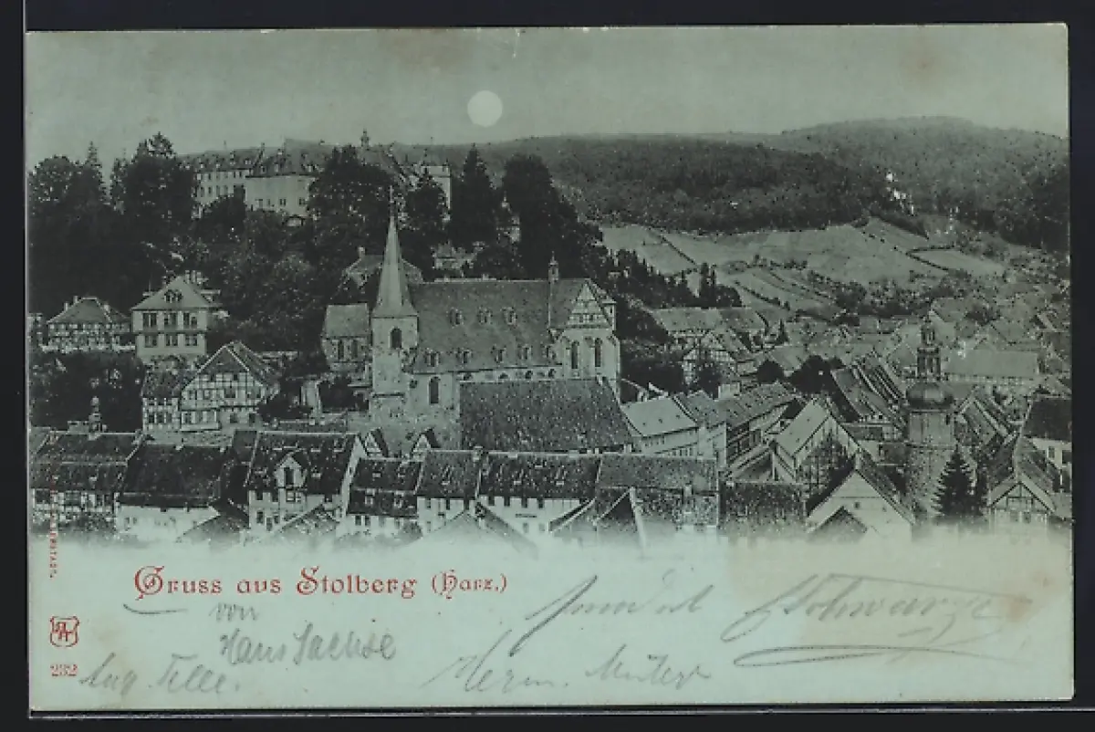 Mondschein-AK Stolberg /Harz, Blick über die Dächer