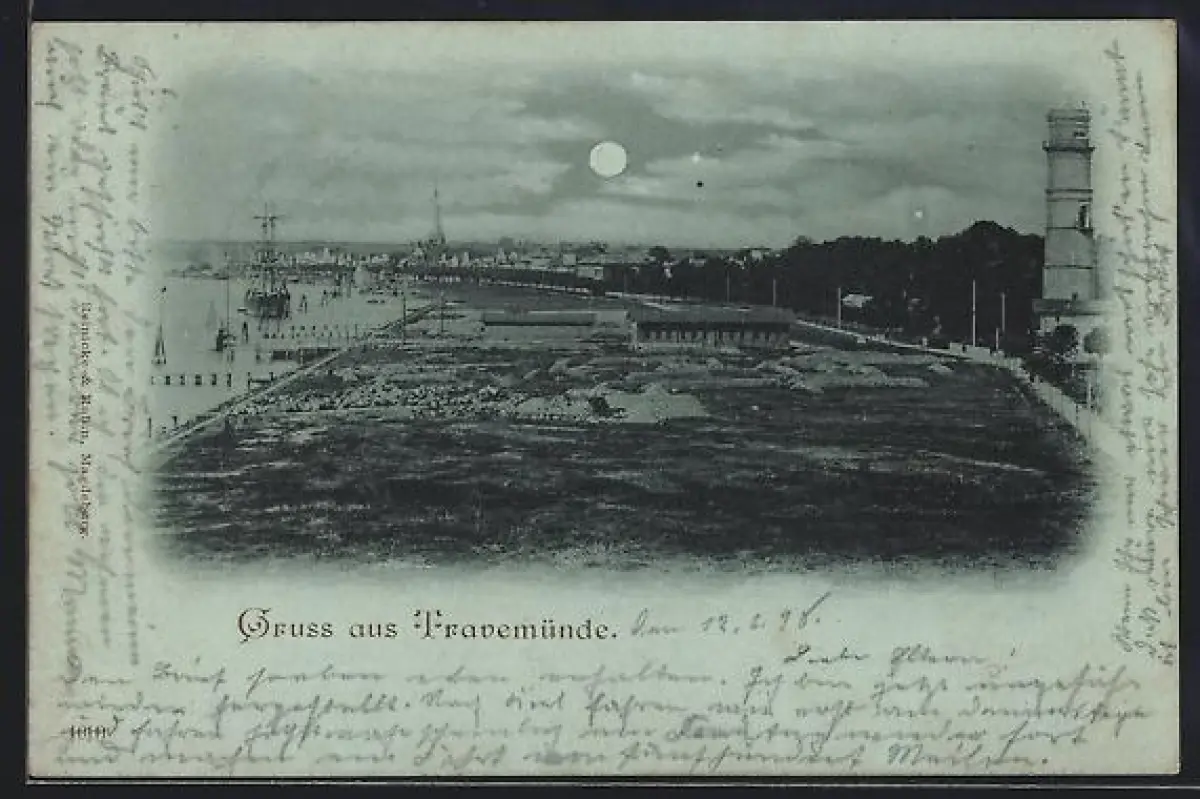 Mondschein-AK Travemünde, Hafen mit Ortspanorama aus der Vogelschau