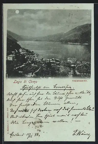 Mondschein-AK Tremezzina /Lago di Como, Teilansicht mit See- u. Bergblick aus der Vogelschau
