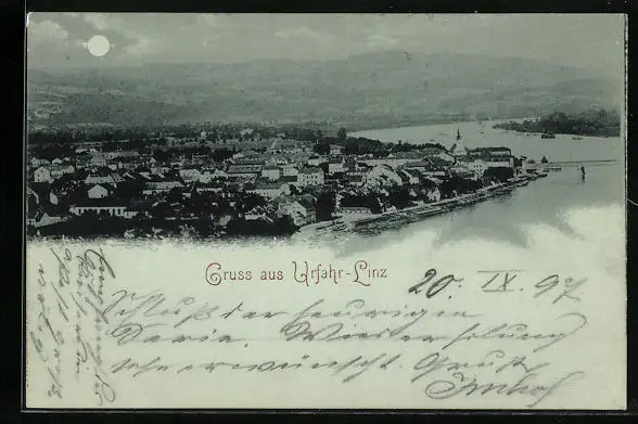 Mondschein-AK Urfahr-Linz, Totalansicht mit Flusspartie