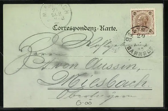 Personenbezogene Daten auf der Rückseite der Karte wurden durch blauen Textmarker unkenntlich gemacht. Die blauen Stellen sind auf die Vorderseite durchgeweicht und wirken sich negativ auf das Postkartenfoto aus