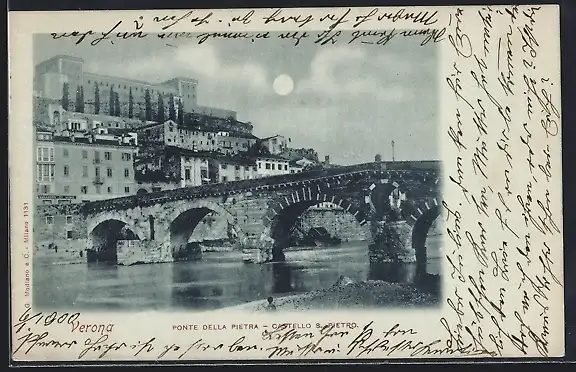 Mondschein-AK Verona, Ponte Della Pietra, Castello S. Pietro