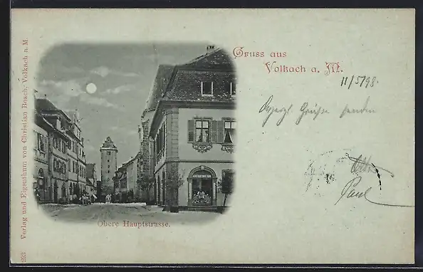 Mondschein-AK Volkach a. M., Obere Hauptstrasse mit Stadtturm