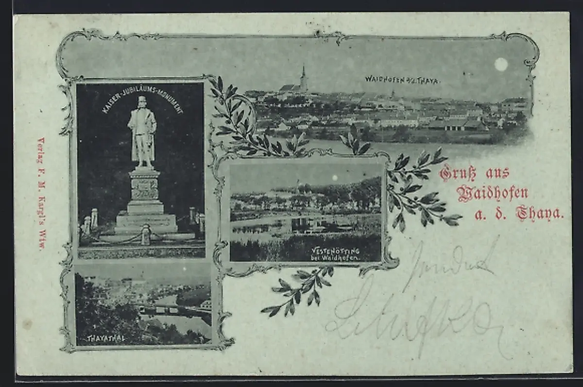 Mondschein-AK Waidhofen a. d. Thaya, Kaiser-Jubiläums-Monument, Vestenötting, Thayathal