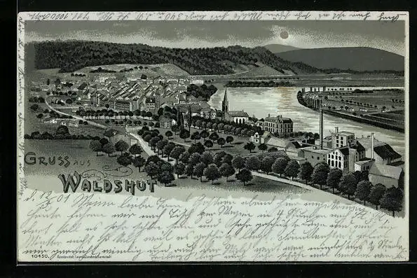 Mondschein-AK Waldshut, Teilansicht mit Kirche