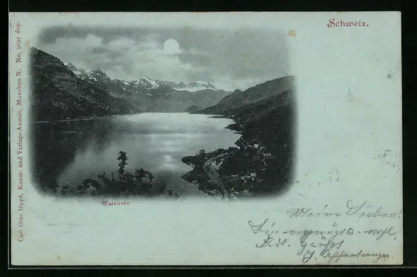 Mondschein-AK Walensee, Walensee aus der Vogelschau