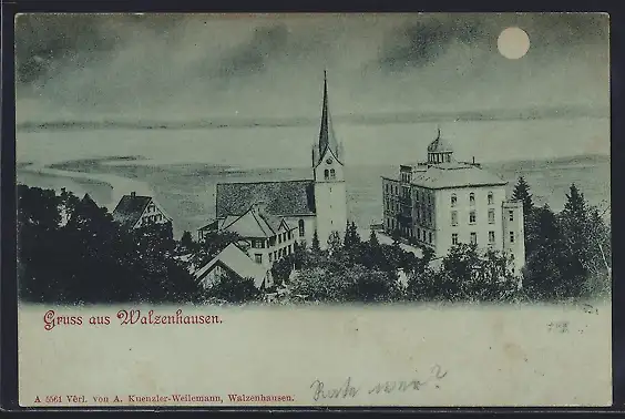 Mondschein-AK Walzenhausen, Ortspartie mit Kirche
