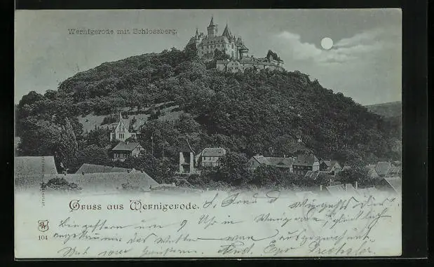 Mondschein-AK Wernigerode, Ortsansicht mit Schlossberg