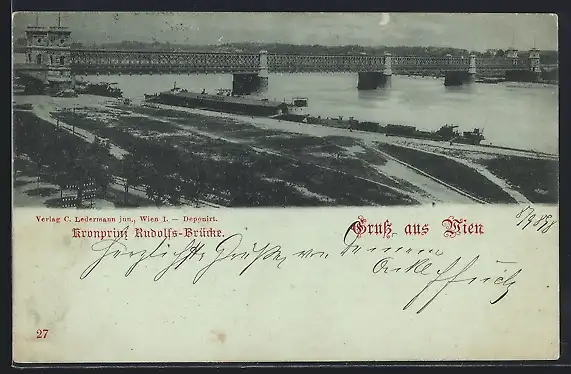 Mondschein-AK Wien, Kronprinz Rudolfs-Brücke mit Ufer und Schiffen