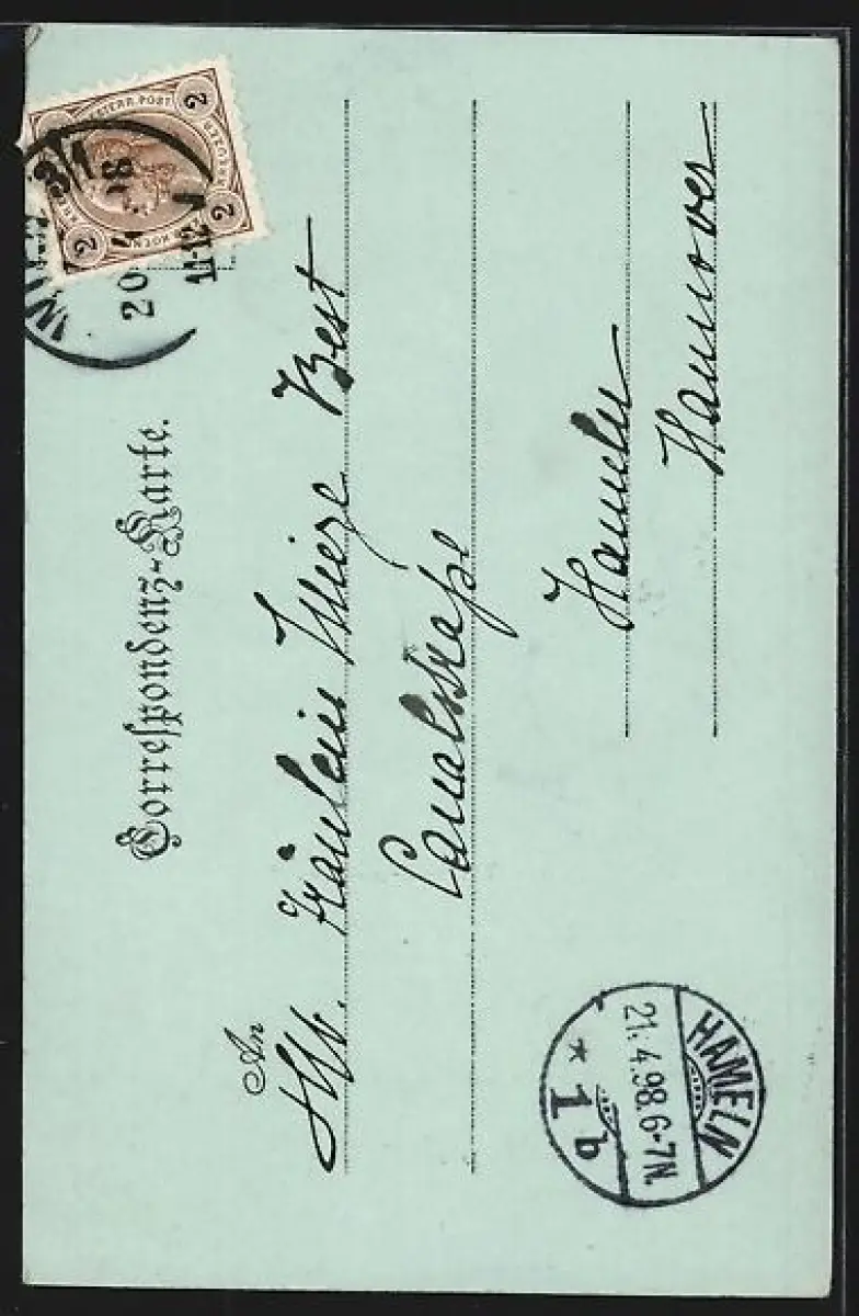 alte Ansichtskarte, gelaufen 1898, Ecken bestoßen, Abriebspur re. oben, Stempelspur, guter Zustand