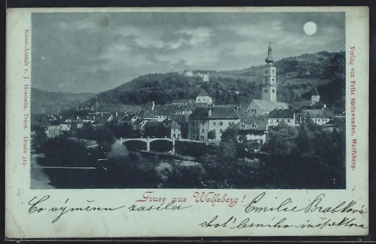 Mondschein-AK Wolfsberg /Kärnten, Teilansicht mit KIrche