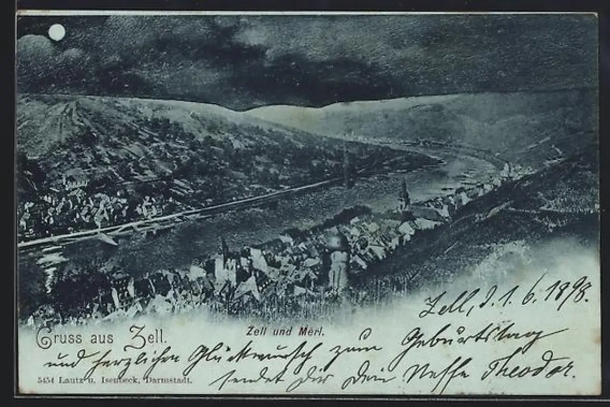 Mondschein-AK Zell / Mosel, Ortsansicht im Vollmondlicht