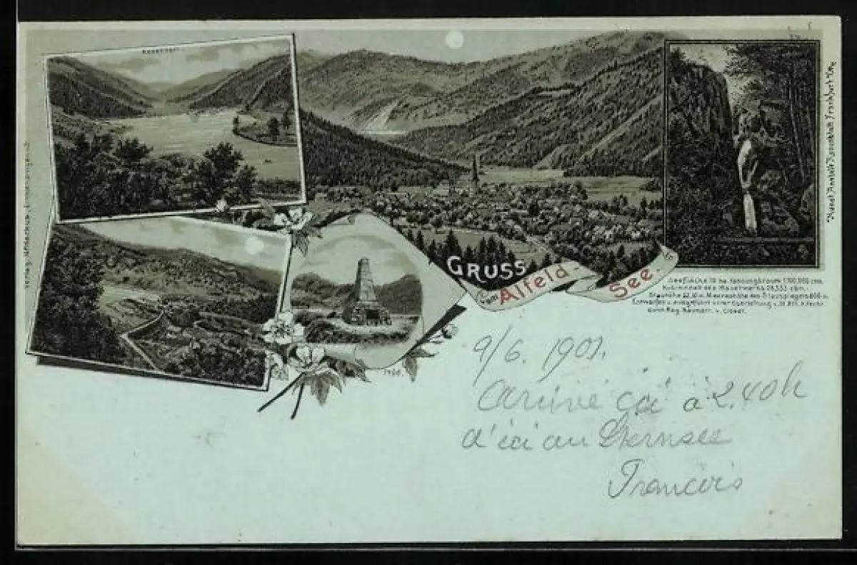 Mondschein-Lithographie Alfeld, Alfeld-See, Reservoir, Denkmal und Wasserfall