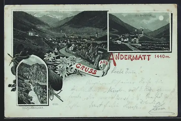 Mondschein-Lithographie Andermatt, Teufelsbrücke und Hospenthal