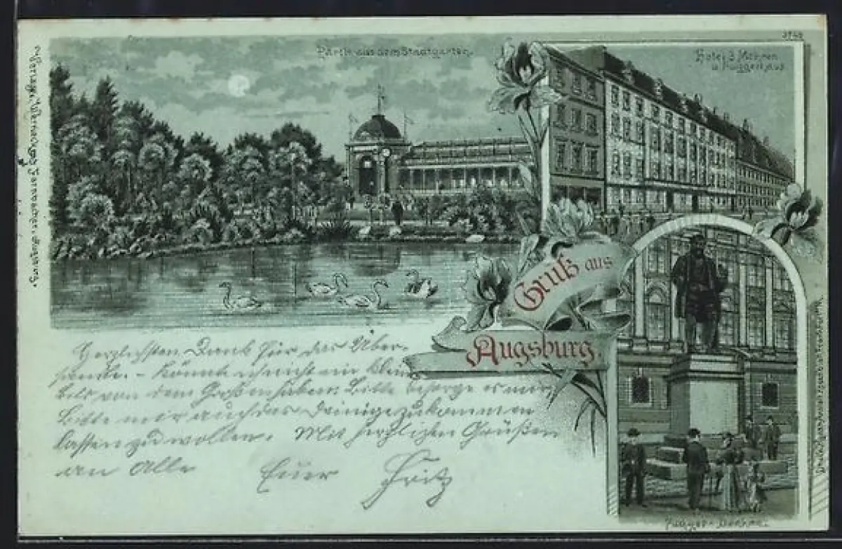 Mondschein-Lithographie Augsburg, Hotel drei Mohren und Fuggerhaus, Stadtgarten, Fugger-Denkmal