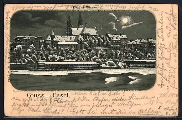 Mondschein-Lithographie Basel, Pfalz mit Münster