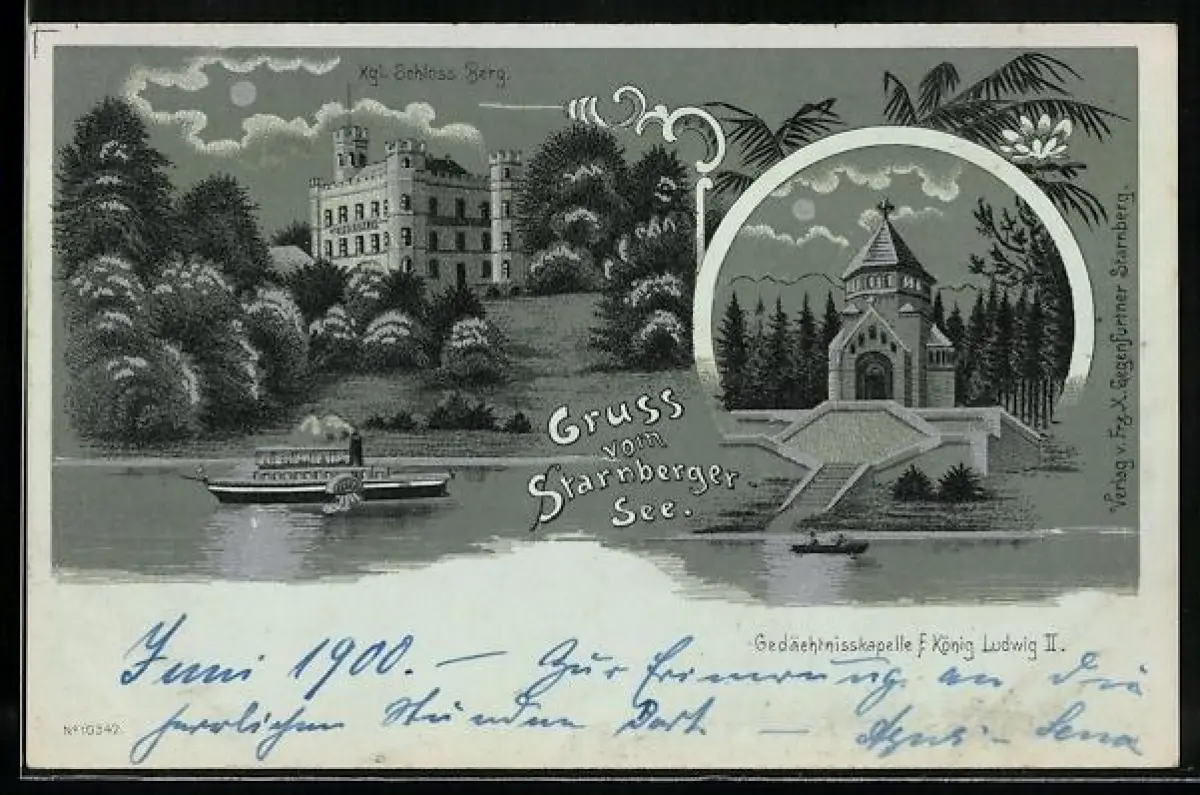 Mondschein-Lithographie Berg / Starnberger See, Schloss und Dampfer, Gedächtniskapelle Ludwig II., silberner Mond