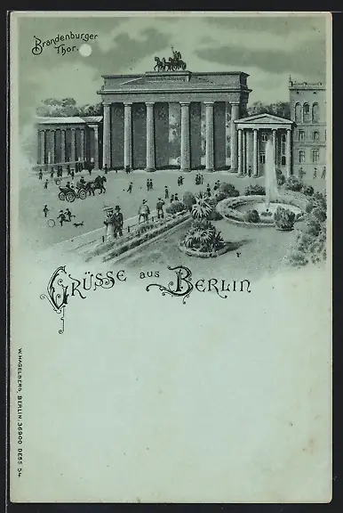 Mondschein-Lithographie Berlin, Brandenburger Tor mit Fontäne