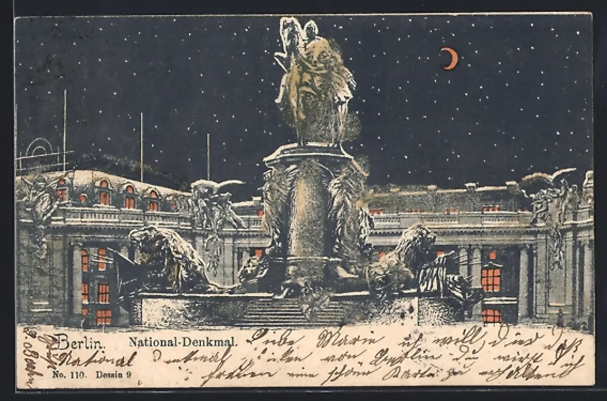 Mondschein-Lithographie Berlin, National-Denkmal bei Nacht