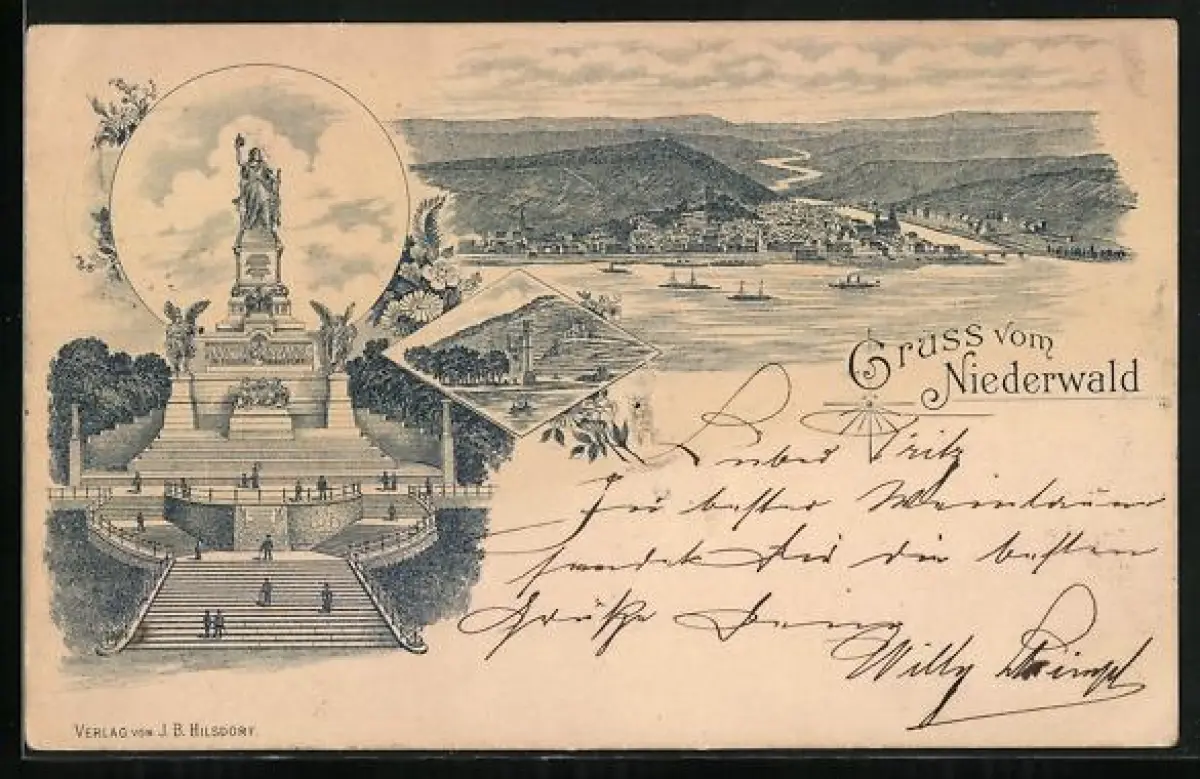 Mondschein-Lithographie Bingen a. Rh., Niederwalddenkmal, Ortsansicht