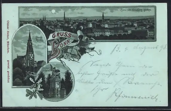 Mondschein-Lithographie Bonn, Teilansicht vom Venusberg gesehen, Evangelische Kirche, Krieger-Denkmal