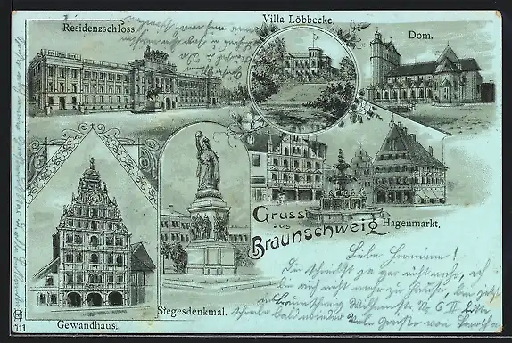 Mondschein-Lithographie Braunschweig, Hagenmarkt, Dom, Villa Löbbecke, Residenzschloss