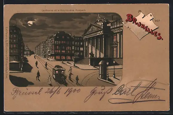 Mondschein-Lithographie Brüssel / Bruxelles, la Bourse et la Boulevard Anspach