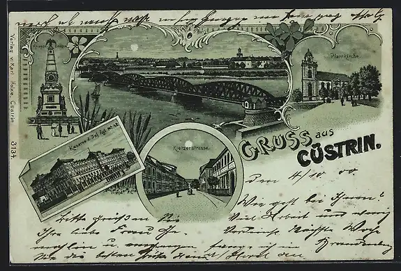 Mondschein-Lithographie Cüstrin, Kaserne d. Inf. Rgt. Nr. 48, Kietzerstrasse, Pfarrkirche